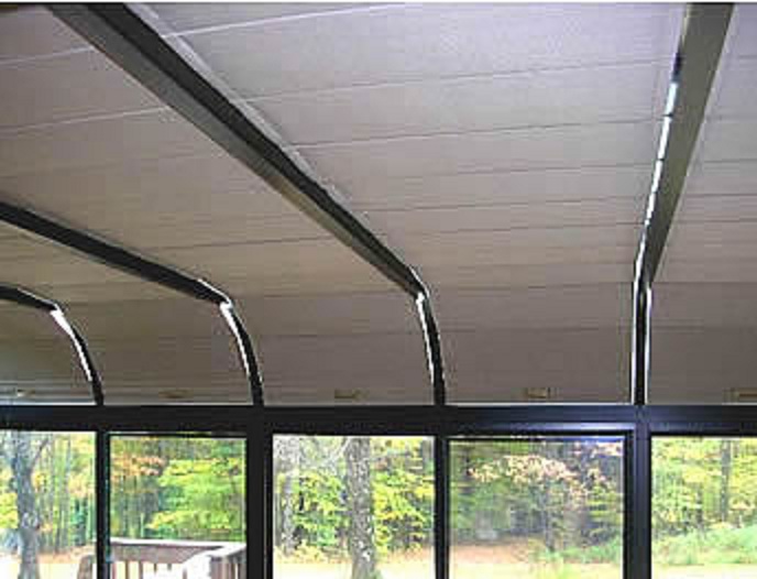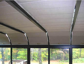 The smooth-operating, gravity-fed system makes every day operation our our Thermal Designs Shades simple. Aluminum tubing, spaced at 10-inch intervals, provide the support for the nylon gliders that fit into the Four Seasons Sunrooms Shade track, allowing the shades to precisely follow the contour of the solarium for a beautiful, fitted look. This proven design comes manual or motorized, your choice. |